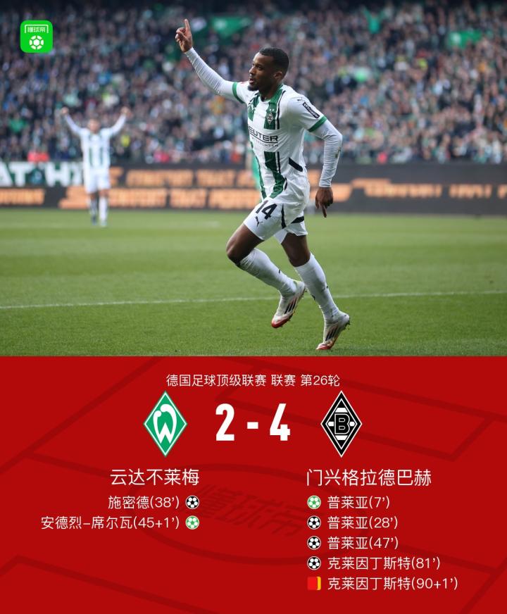 门兴格拉德巴赫4-2战胜云达不莱梅,普莱亚帽子戏法